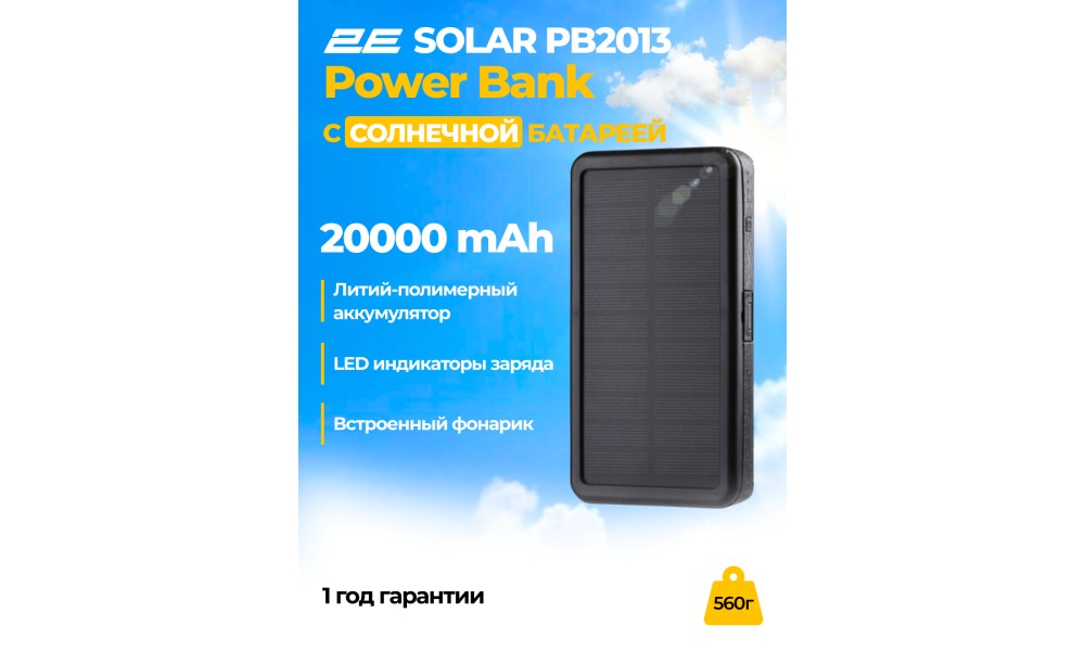 Внешний аккумулятор 2E Solar емкостью 20000 мАч — это незаменимый гаджет для путешественников, туристов и тех, кто часто находится вдали от розеток. Главная особенность модели — встроенная солнечная панель, позволяющая восполнять заряд аккумулятора прямо в пути, используя энергию солнца.