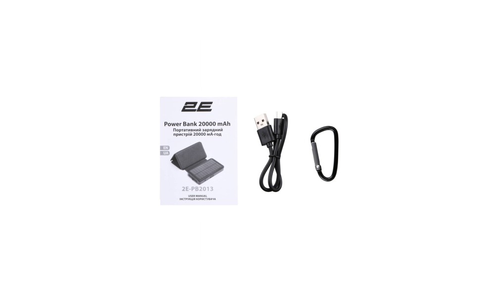 Комплектация: Power Bank 2E Solar, кабель для зарядки, съемная солнечная панель, инструкция.