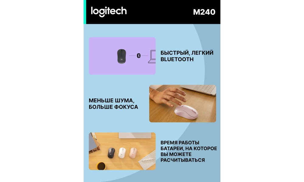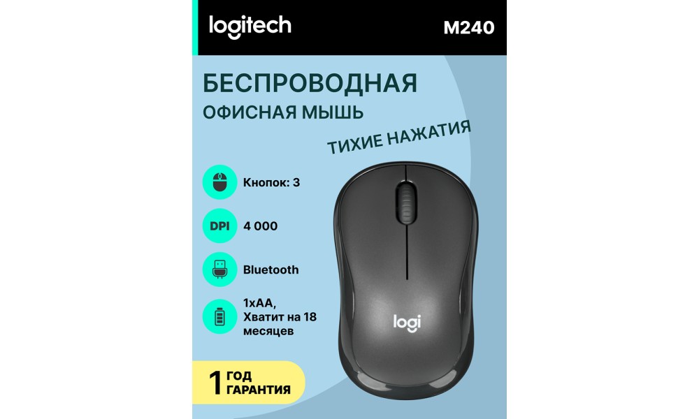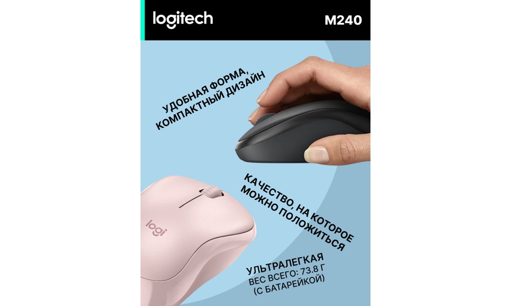 Лёгкая, тихая и энергоэффективная, Logitech M240 создаёт идеальные условия для продуктивной работы, учёбы или отдыха. Она сочетает продуманную эргономику, элегантный внешний вид и технологичную надёжность, которой славится Logitech.