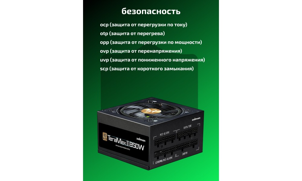 Zalman Teramax 2 850W — это мощный и надёжный блок питания, созданный с учётом требований современных игровых и профессиональных систем. Он обеспечивает стабильное и качественное питание компонентов даже при высоких нагрузках, что особенно важно для систем с производительными видеокартами и многоядерными процессорами. Над этой серией поработали специалисты Zalman, сделав ставку на энергоэффективность, тишину и долговечность.