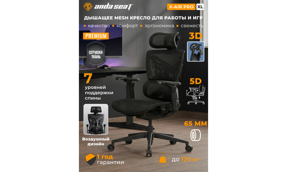 Игровое кресло Anda Seat Gaming mesh chair X-Air Pro, экокожа, с подлокотниками, регулировка, черное, AD-WY-01-BBC-B01