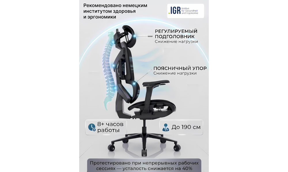 Это кресло идеально подходит для работы, учебы, игр и стриминга, сочетая эргономику, удобство и долговечность. Оно обеспечивает правильную поддержку спины и шеи, настраивается под индивидуальные потребности и помогает оставаться продуктивным и комфортным даже при длительных сессиях.