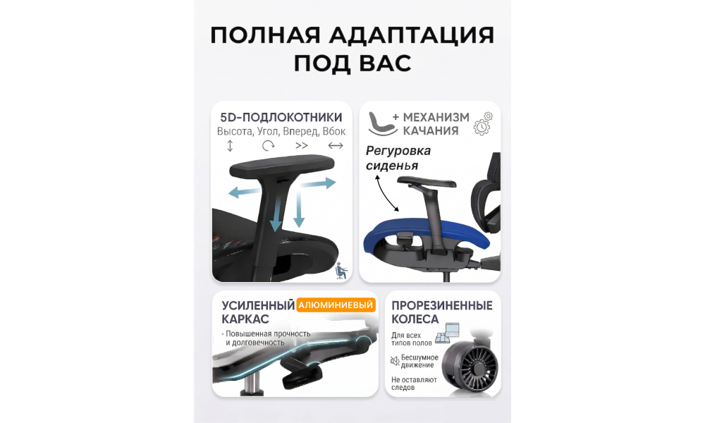 Кресло предлагает полную регулировку для идеальной посадки: 5D и 4D подлокотники, 3D подголовник и регулировка высоты спинки до 8 уровней (8 см) позволяют настроить кресло точно под ваши потребности. Эти функции делают использование максимально комфортным для людей разного роста и телосложения.
