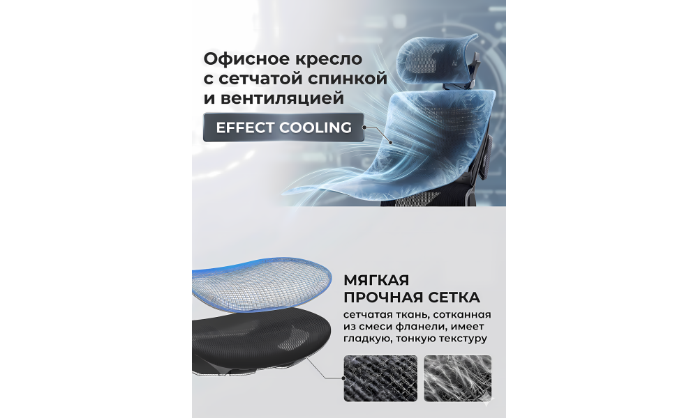 Материал обивки — сетчатая ткань, связанная с фланелью, которая приятна на ощупь, хорошо пропускает воздух и предотвращает перегрев при долгой работе за компьютером.