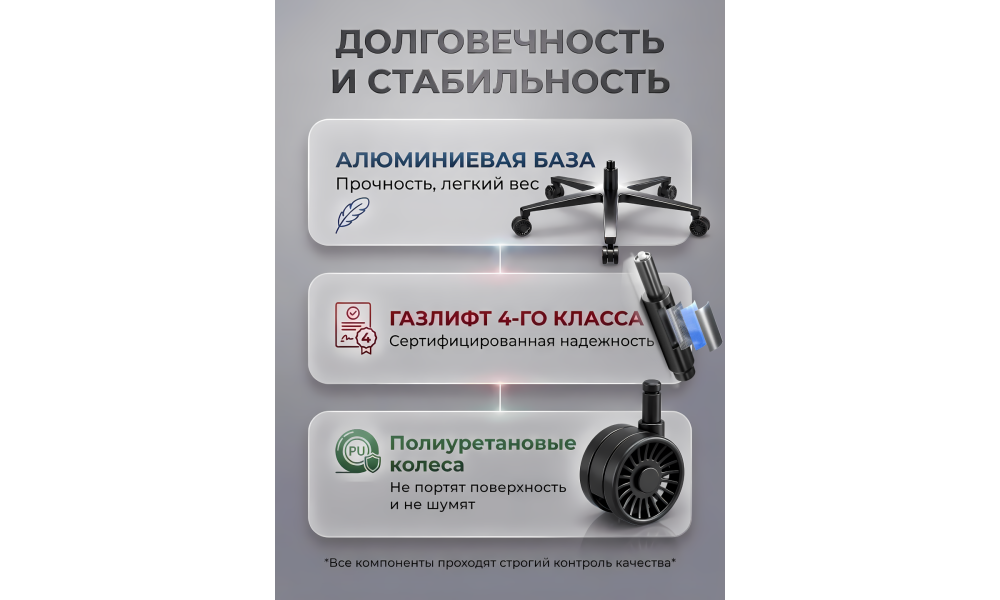 Кресло обладает повышенной стабильностью благодаря прочной металлической колесной базе и газовому амортизатору SGS класса 4, который выдерживает нагрузку до 265 фунтов (≈120 кг). Такая конструкция обеспечивает долговечность и безопасное использование в течение многих лет.