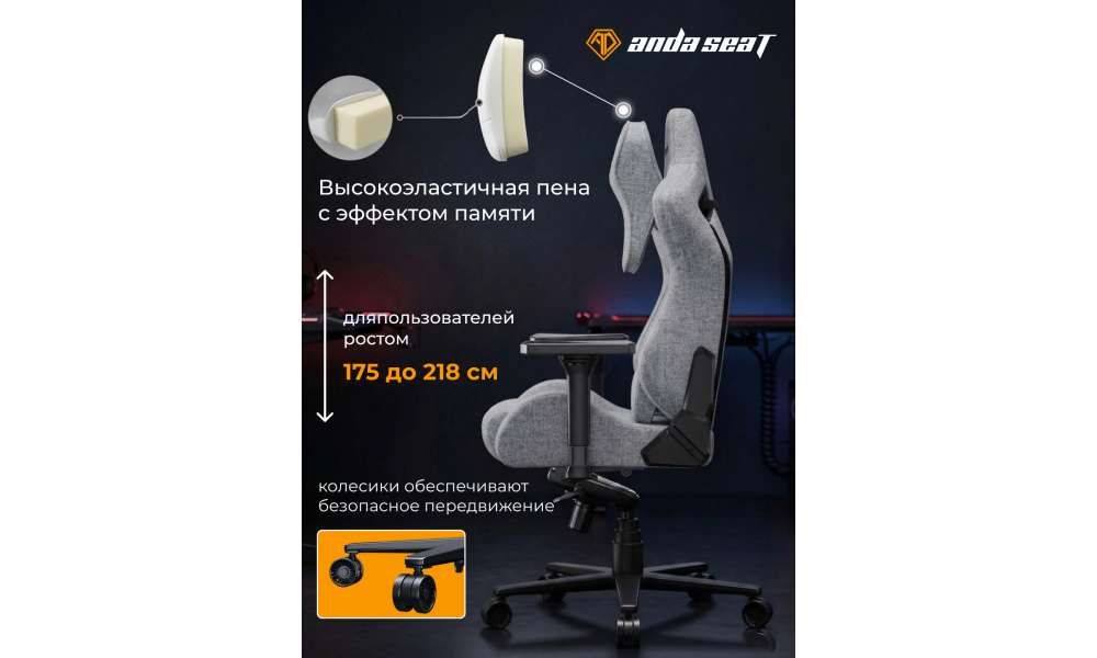 Кресло оборудовано встроенным подголовником, обеспечивающим поддержку шеи, что особенно важно при длительных игровых сессиях или работе за компьютером. Широкая крестовина диаметром 730 мм и полиуретановые ролики делают кресло устойчивым и маневренным, а гладкая поверхность роликов защищает пол от царапин. Несмотря на солидные габариты и вес кресла, оно легко перемещается и адаптируется под пространство пользователя.