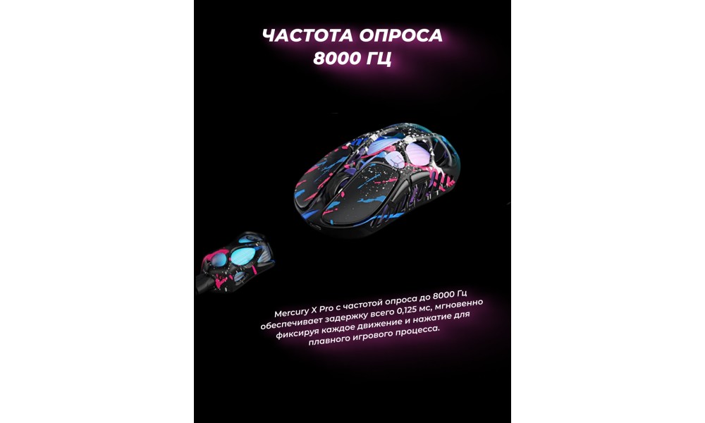 Благодаря частоте опроса до 8000 Гц, Mercury X Pro обеспечивает ввод в реальном времени с задержкой 0,125 мс, гарантируя мгновенную регистрацию каждого движения и клика. Такая сверхнизкая задержка обеспечивает плавный игровой процесс без лагов, делая мышь идеальным инструментом для киберспорта и соревновательных игр.