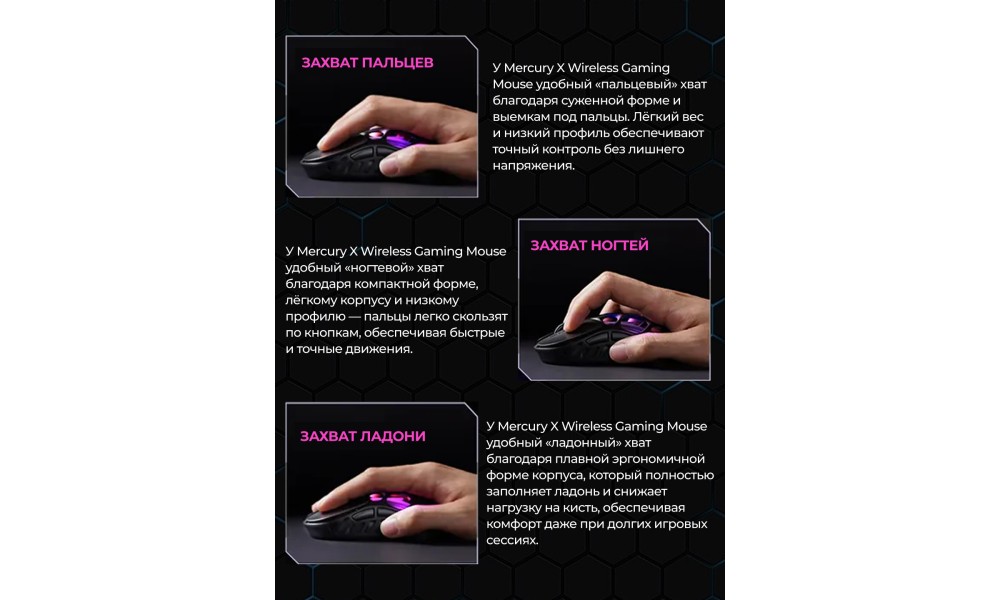Каркас из магниевого сплава толщиной 0,8 мм обеспечивает идеальный баланс между прочностью и легкостью, придавая мыши прочный металлический вид, сохраняя при этом её легкую конструкцию. Вес мыши Mercury X Pro составляет всего 49 г, что позволяет выполнять быстрые и точные движения, не перегружая кисть или запястье.