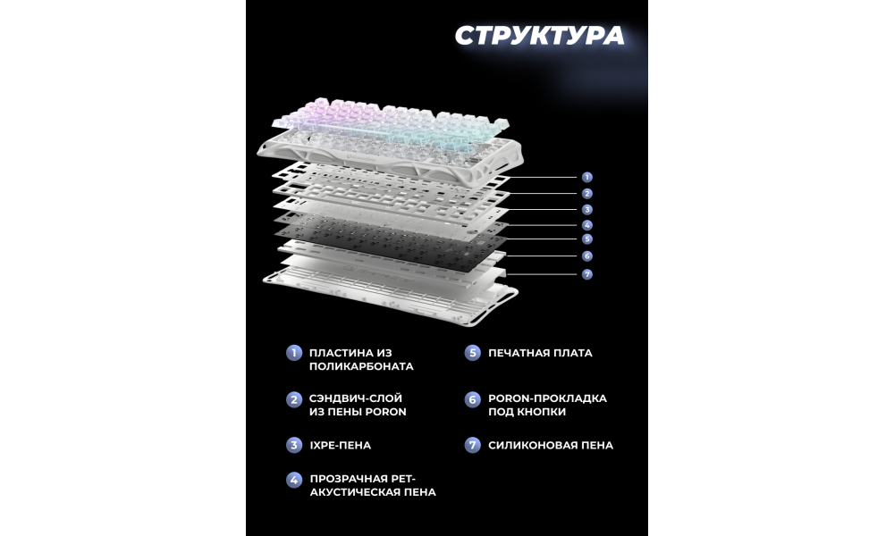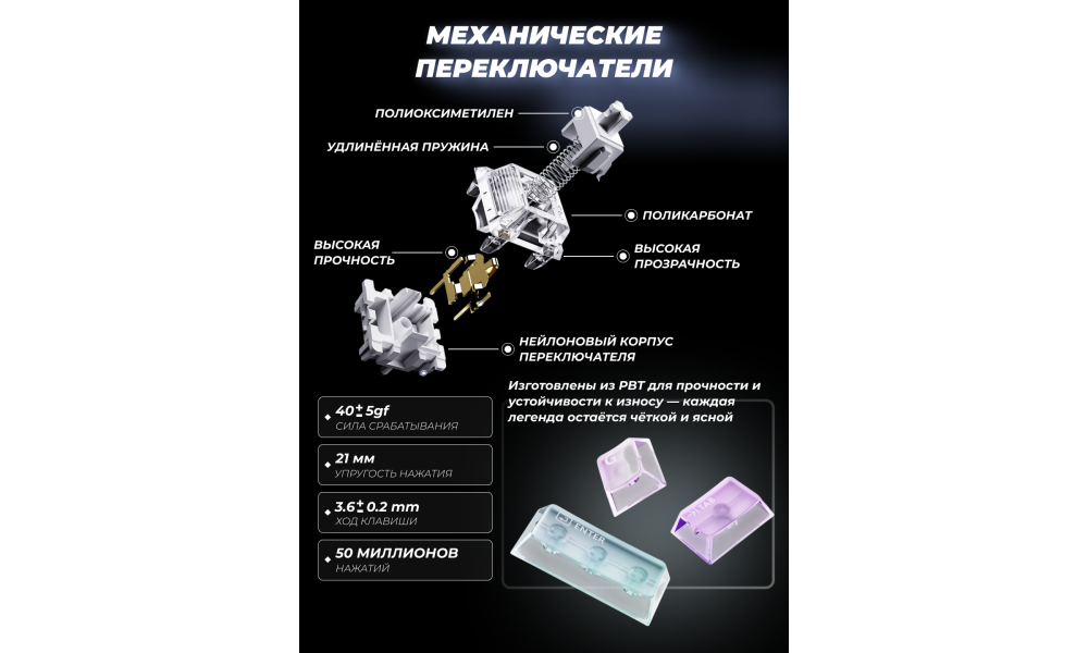 Прозрачные кейкапы: Выполнены из износостойкого поликарбоната (PC), что максимально подчеркивает эффекты RGB-подсветки.