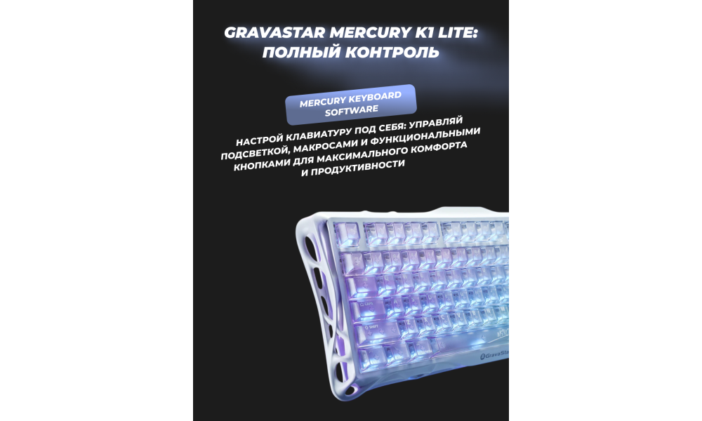 GravaStar Mercury K1 Lite — это сочетание футуристического дизайна и профессиональных характеристик. Модель выделяется уникальным «скелетонизированным» корпусом и прозрачными элементами, создающими неповторимую эстетику на рабочем столе.