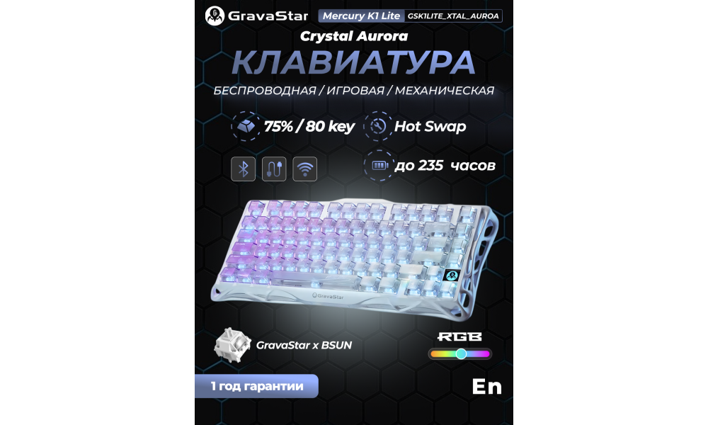 Клавиатура механическая GravaStar Mercury K1 Lite 80keys, GravaStar x BSUN Grey, BT/WL/USB, RGB, Crystal Aurora