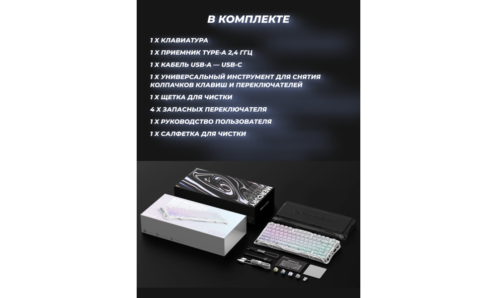 • Прозрачные кейкапы: Выполнены из износостойкого поликарбоната (PC), что максимально подчеркивает эффекты RGB-подсветки.