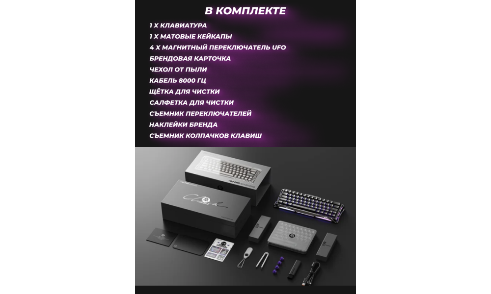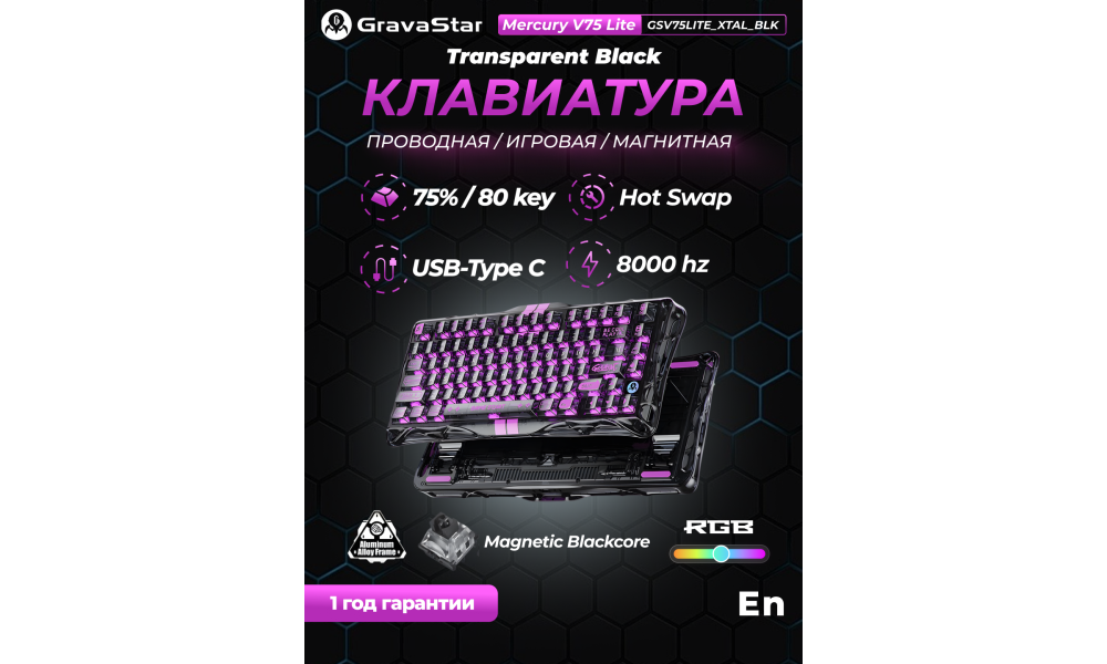 Mercury V75 Lite — это место, где индустриальный дизайн встречается с акустической эстетикой. Первая клавиатура от GravaStar в формате 75% с магнитными переключателями, созданная для тех, кто ценит точность срабатывания, комфорт конструкции Gasket Mount и эффектную RGB-подсветку.