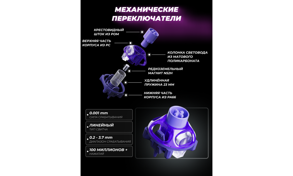 Регулируемая точка активации: Настраивайте глубину хода от 0,1 до 4,0 мм с шагом в 0,1 мм. Мгновенный отклик для быстрых комбо или глубокое нажатие для защиты от случайных кликов.