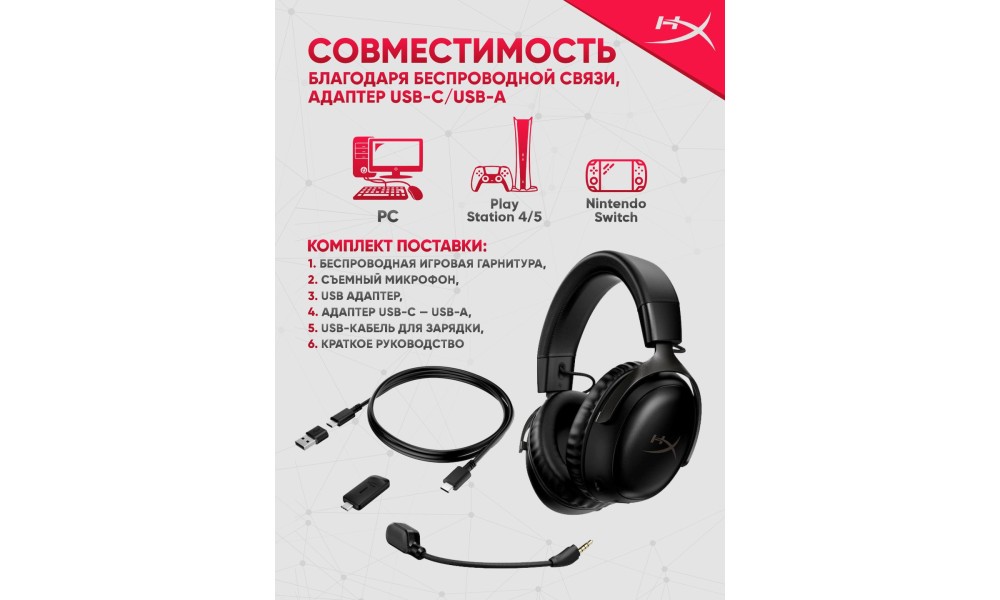 Наушники HyperX Cloud III Wireless Black предлагают универсальное подключение, обеспечивая совместимость с широким спектром платформ, включая ПК, PlayStation 4, 5 и Nintendo Switch. Это достигается благодаря использованию комбинированного аудио разъёма 3,5 мм и USB-разъема, что позволяет вам легко переключаться между устройствами. С использованием USB-подключения вы получаете доступ к расширенным функциям, таким как поддержка виртуального 7.1-канального звука и регулировка настроек через специальное программное обеспечение HyperX NGENUITY.