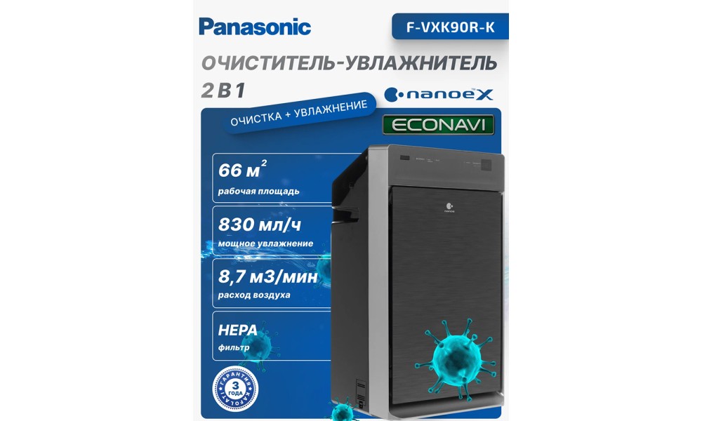 Воздухоочиститель Panasonic F-VXK90R-K - это климатический комплекс high end класса черного глянцевого цвета, который увлажняет, очищает и ионизирует воздух в помещении. Он с легкостью очистит дом от крупных и мелких частиц бытовой и даже строительной пыли, аллергенов, вирусов, бактерий, неприятных запахов и других вредных веществ.