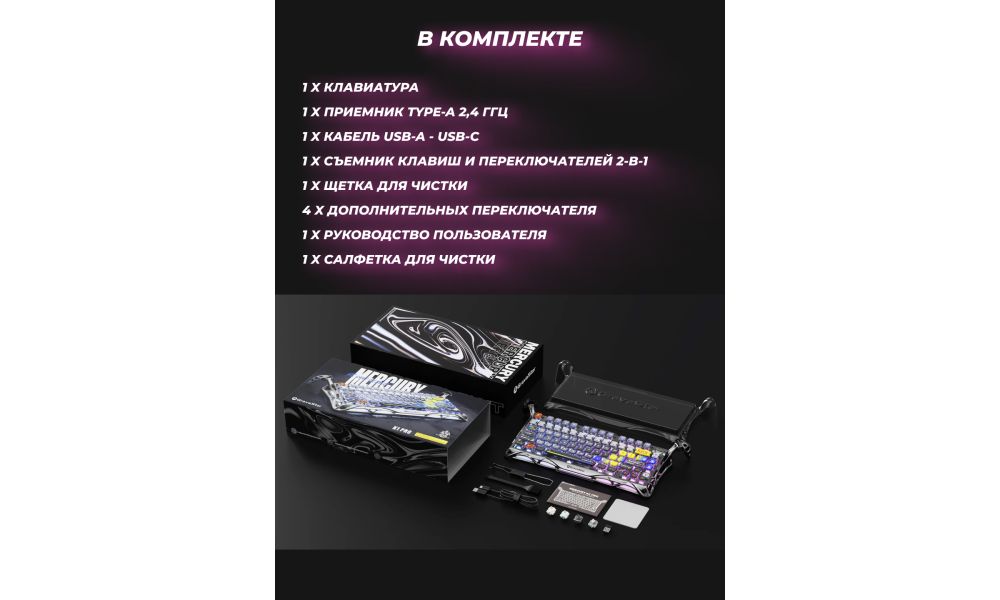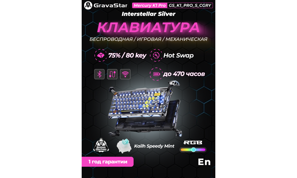 Клавиатура механическая GravaStar Mercury K1 Pro 80keys, GravaStar x Kailh Speedy Mint, BT/WL/USB, RGB, Interstellar Silver