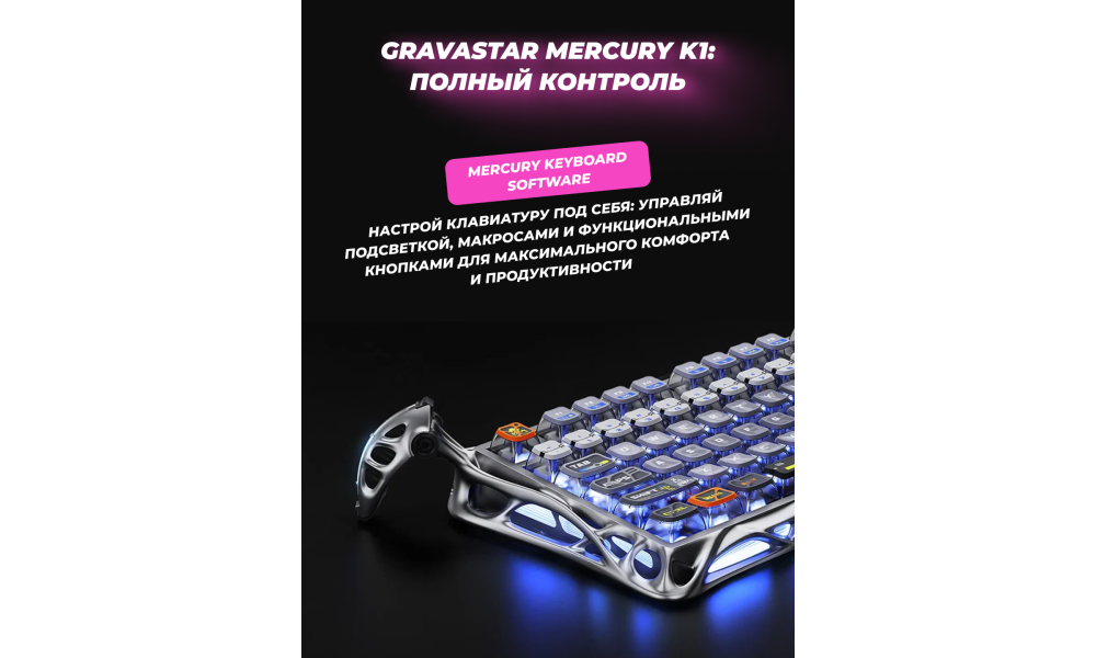 GravaStar Mercury K1 Pro — это премиальное решение в компактном 75% формате, сочетающее в себе футуристический дизайн и исключительную надежность. Модель выполнена в корпусе из алюминиевого сплава серебристого цвета, что обеспечивает не только современный вид, но и стабильность устройства на столе.