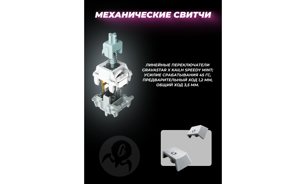Переключатели Kailh Speedy Mint: Линейные свитчи обеспечивают быстрое срабатывание с оптимальным усилием в 45 гф.