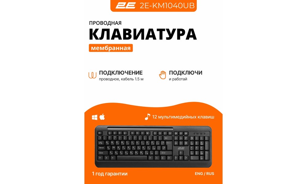 Клавиатура мембранная 2E KM1040 — это удачное сочетание классического дизайна, практичности и комфорта для повседневной работы. Она создана для тех, кто ценит привычную раскладку, стабильность проводного подключения и тихий, мягкий ход клавиш.
