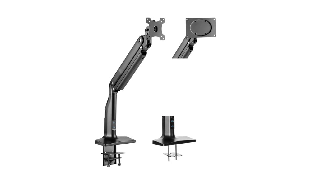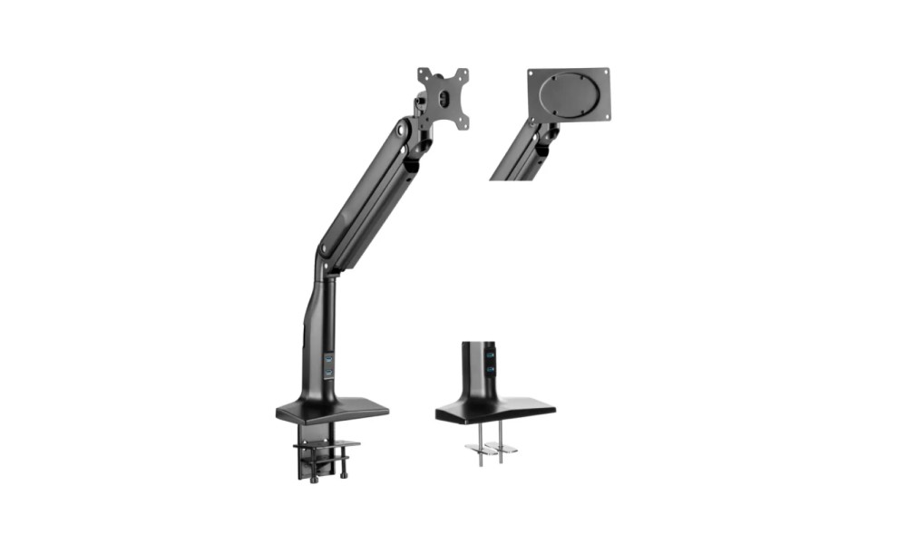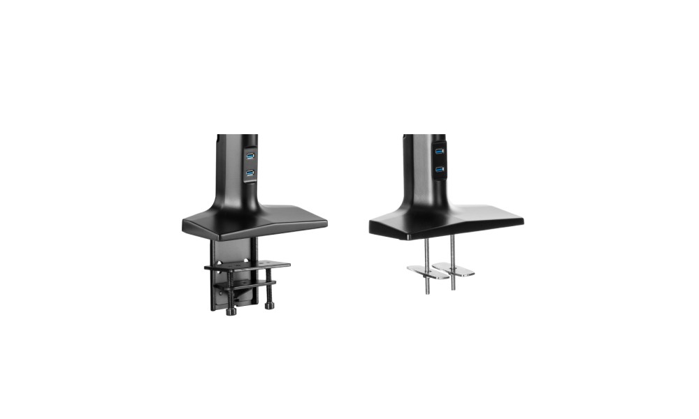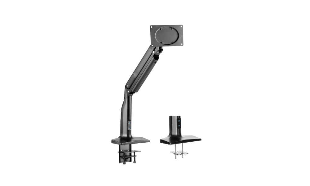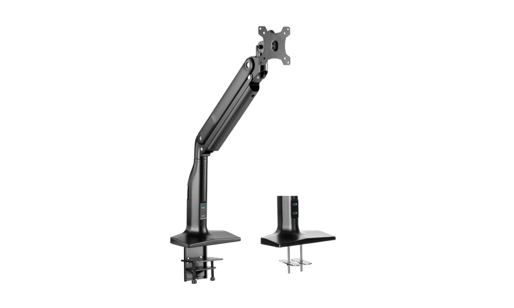 Подставка для монитора со встроенным USB-хабом на два порта стандарта 3.0. Кронштейн подставки оснащен чрезвычайно удобным и оптимальным креплением и не займет много места на рабочей поверхности. При помощи системы прокладки кабелей все провода можно аккуратно собрать вместе. Подставка подходит для мониторов диагональю от 17″до 43″ и выдерживает нагрузку до 18 кг. Специальный пружинный механизм с возможностью регулировки, позволяет самостоятельно настраивать оптимальную позицию монитора — наклон/поворот/вращение.