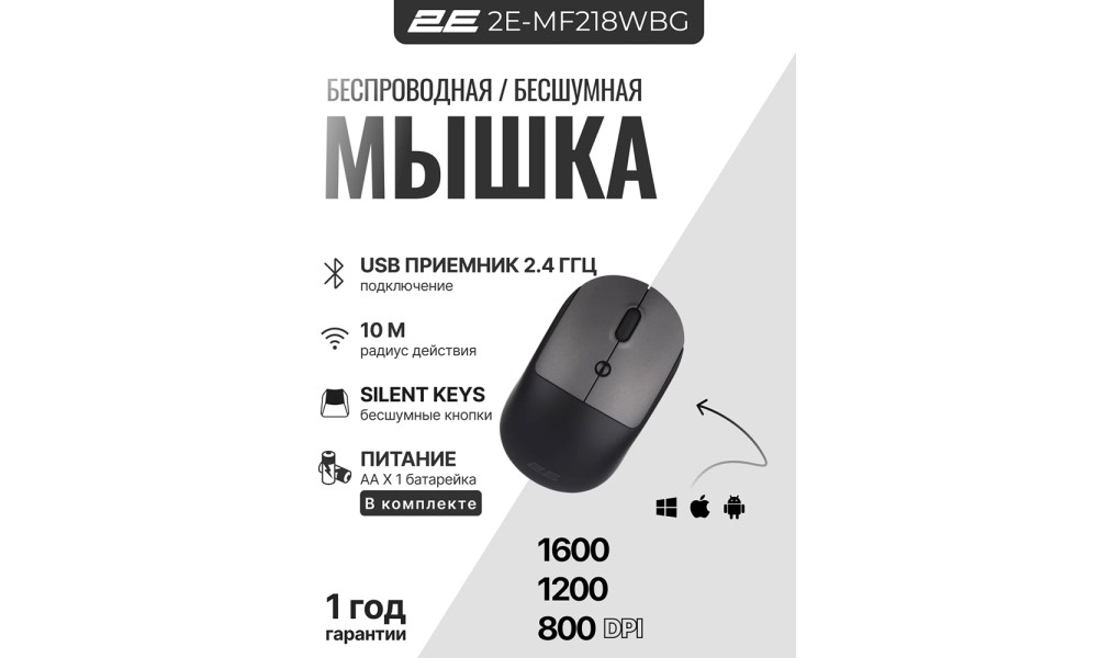 Беспроводная мышь 2E MF218 Silent WL BT Black/Gray - это высококачественный аксессуар, который обеспечивает комфорт и точность при использовании мыши.