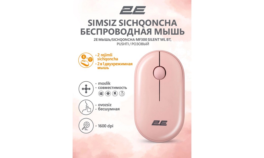 Беспроводная мышь 2E MF300 Silent BT Mallow Pink — это не просто аксессуар, а полноценный инструмент для повышения вашей продуктивности и удобства. Ее стильный дизайн, функциональные возможности и высокое качество делают её идеальным выбором для пользователей всех уровней. Если вы ищете надежное и красивое устройство, способное удовлетворить ваши потребности в работе и развлечениях, мышь 2E MF300 станет вашим лучшим решением. Откройте для себя новый уровень комфорта и стиля с 2E MF300!