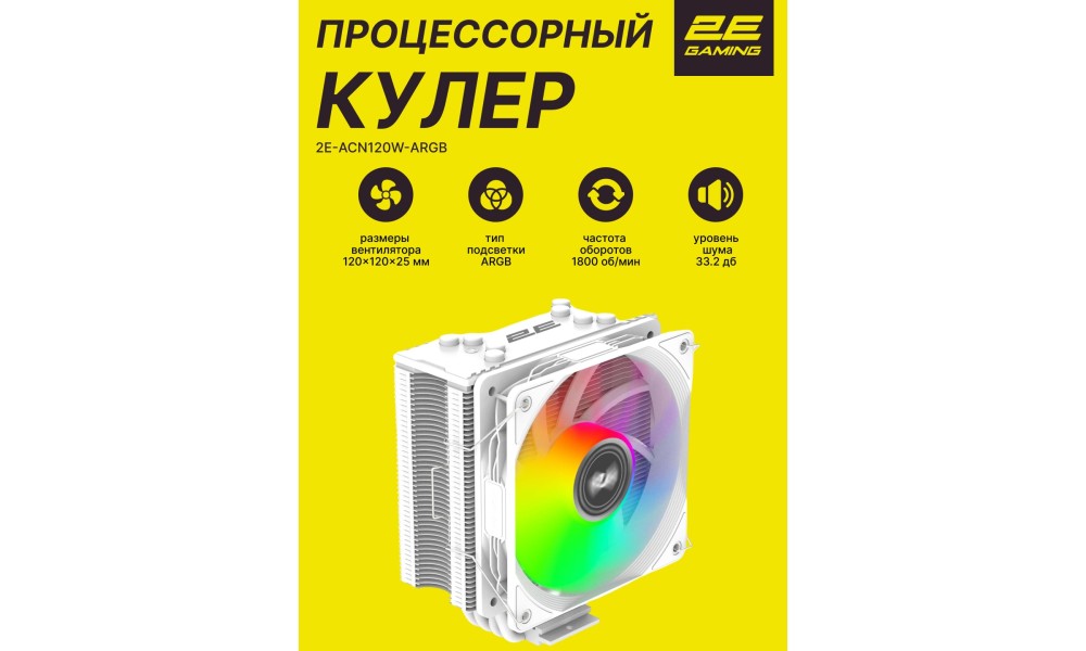 Процессорный кулер 2E GAMING Air Cool ACN120W-ARGB в белом исполнении — это сочетание премиальной эстетики и высокой эффективности охлаждения. Обладая показателем отвода тепла 180 Вт, эта "башня" легко справляется с перегревом современных многоядерных процессоров, становясь центральным элементом дизайна вашего ПК.