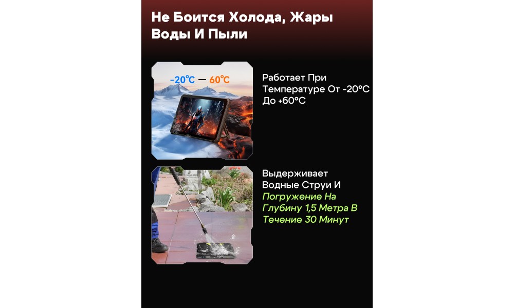 Корпус планшета сертифицирован по стандартам IP68, IP69K и MIL-STD-810H. Он не боится погружения в воду, падений на бетон, воздействия масел, кофе и даже горячей воды под давлением. Огнестойкая конструкция UL94 HB делает его незаменимым на стройплощадках и в походах.