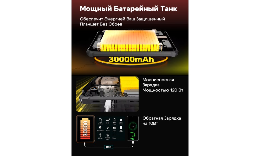 - Батарея 30000 мАч: Забудьте о зарядке. Планшет может работать днями в режиме проекции и неделями в режиме ожидания.