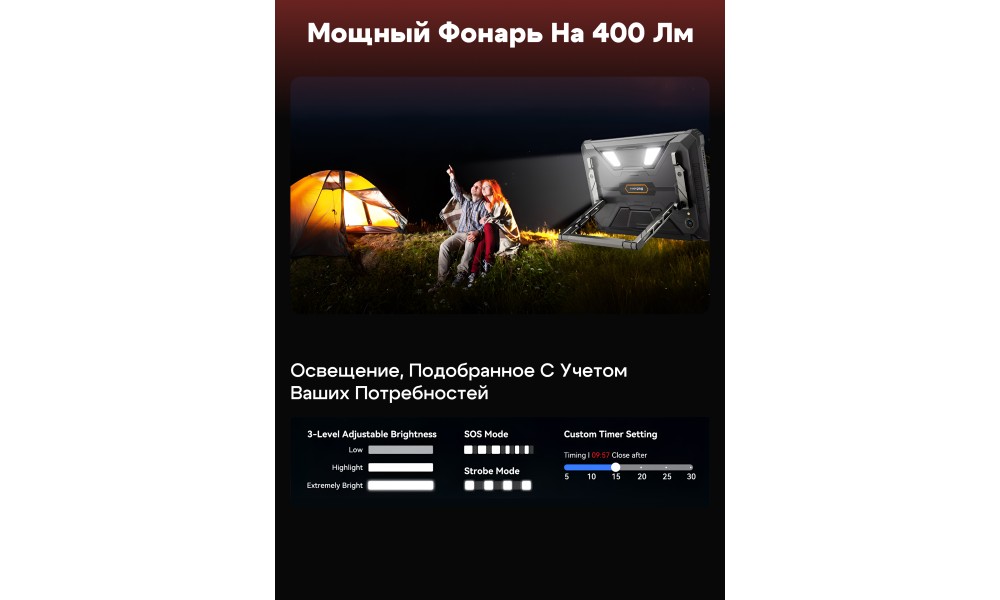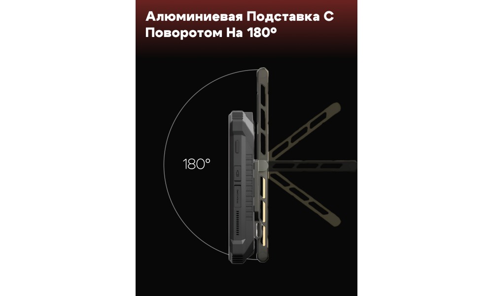 Главная особенность модели — встроенный 1080P лазерный проектор с яркостью 200LM и автофокусом. Создавайте проекцию до 120 дюймов прямо на стене или тенте палатки. Встроенная алюминиевая подставка с поворотом на 180° позволяет настроить угол изображения без лишних усилий.