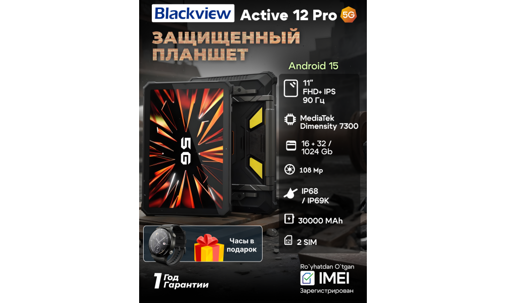 Планшет Blackview Tab Active 12 Pro, 16 ГБ/1 ТБ, 11", IPS 120 Гц, 30000 mAh, 5G, Black + Смарт-часы Blackview R7 Pro 46mm в подарок