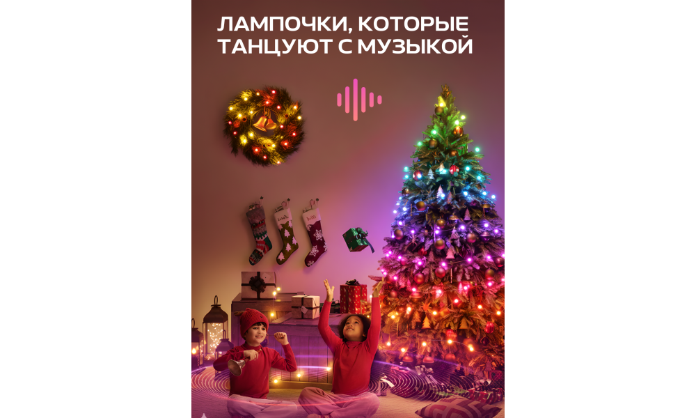 - Визуализируйте музыку: Поднимите атмосферу праздника с помощью уличных гирлянд Govee со встроенным микрофоном под вашу музыку.