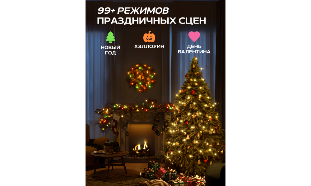 - 99+ динамических сюжетных режимов: Разнообразные предустановленные режимы праздничных гирлянд Govee отвечают любым требованиям для любого случая.