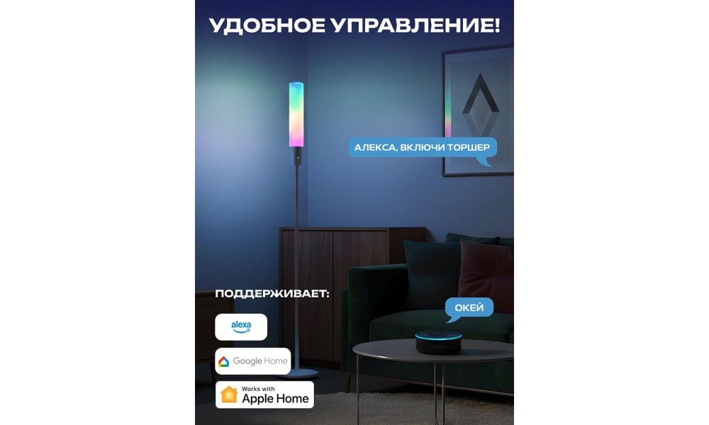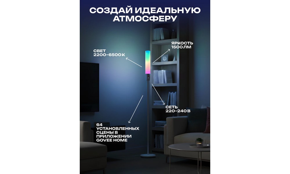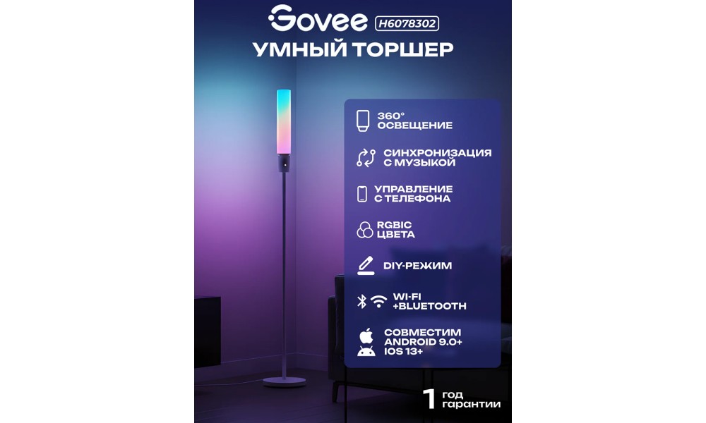 Торшер умный Govee H6078, 1500Lm, RGBICW, WI-FI/Bluetooth, Белый